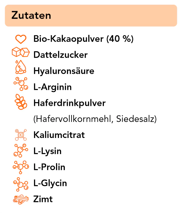 AURA kombiniert hochwertigen Bio-Kakao mit einer funktionalen Rezeptur, die speziell auf die Bedürfnisse Deiner Haut abgestimmt ist. Hyaluronsäure, pflanzliches Kaliumcitrat und wichtige Aminosäuren wie L-Prolin, L-Lysin, L-Glycin und L-Arginin bilden die Basis – ergänzt durch Dattelzucker und Zimt. Ein Kakao mit Kollagen, der hält, was er verspricht: nicht zu süß, nicht zu aufdringlich – einfach wohltuend. 🥰
