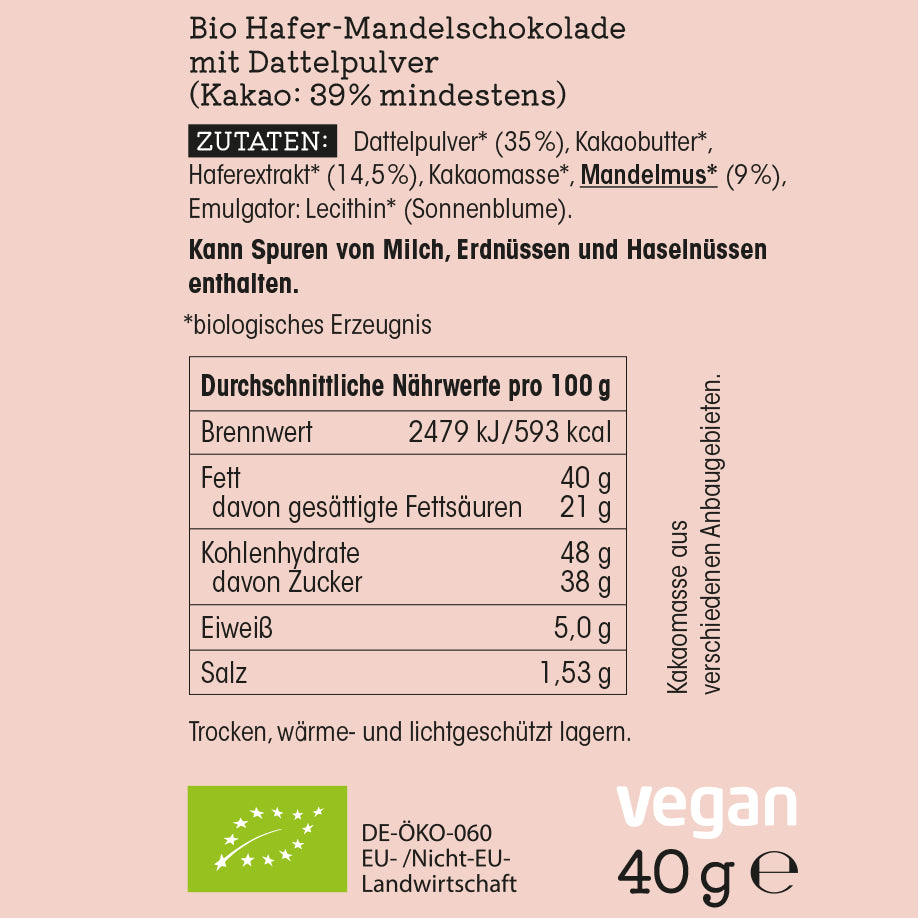Sie enthält Mandelmus, ist also nicht nussfrei. Der Hafer stammt aus glutenfreiem Anbau, aber es kann Spuren von glutenhaltigem Getreide geben – je nachdem, wie sensibel Du reagierst: Daher für Zöliakie nicht empfohlen.