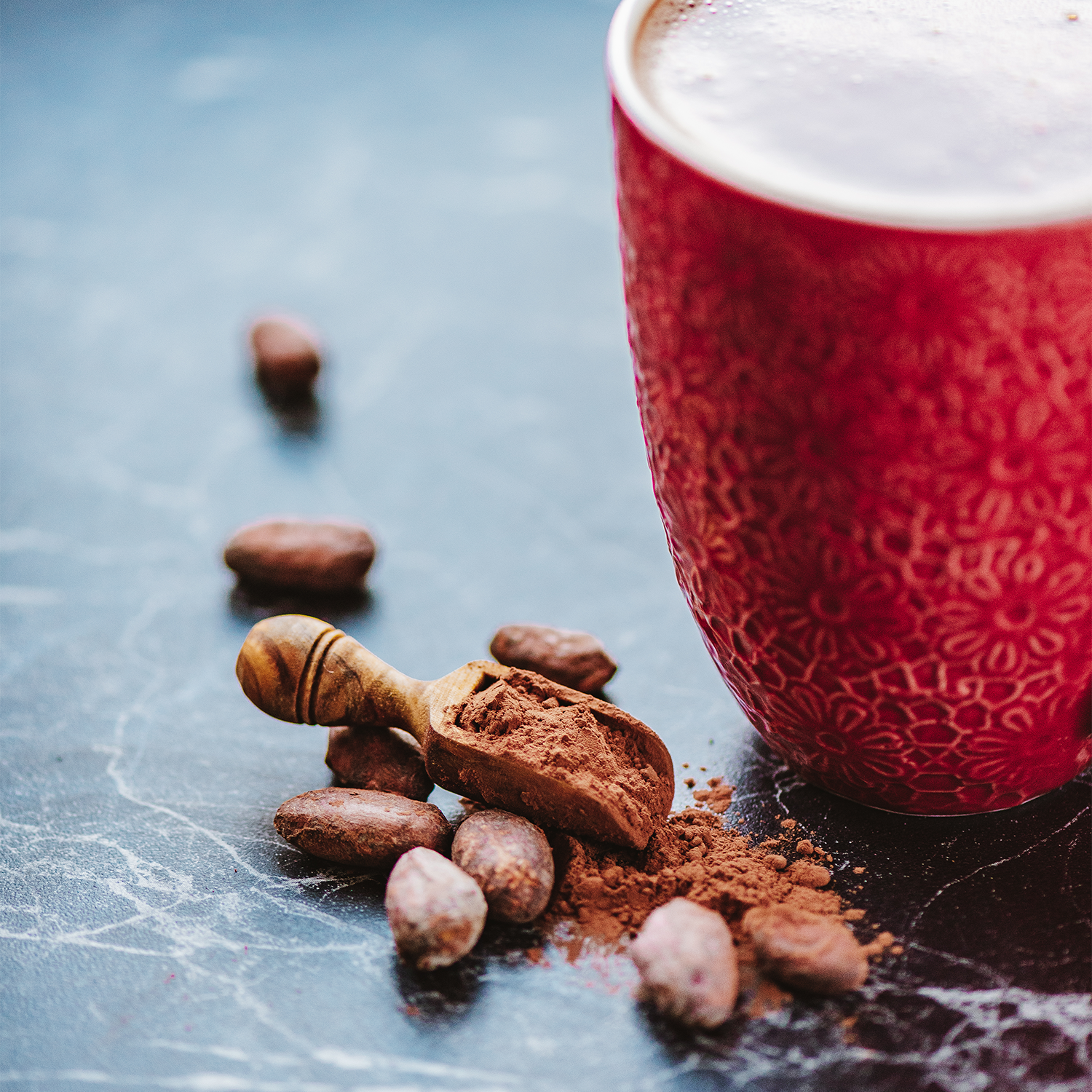 heiße Kakao-Drinks (mit Pflanzendrink, Milch oder Wasser)
