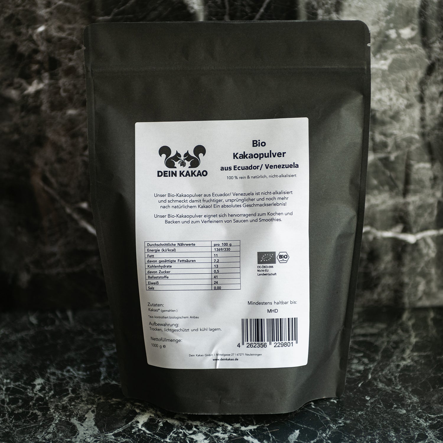 Wie unterscheidet sich unser Kakao von herkömmlichem Backkakao aus dem Supermarkt? In gleich mehreren Punkten: Unser Kakaopulver ist nicht alkalisiert – das heißt, er behält seine natürlichen Aromen und eine angenehm fruchtig-herbe Note. Zudem stammt unser Kakao aus Bio-Anbau in Venezuela und Ecuador und wird in Deutschland verarbeitet – transparent, pur und ohne versteckte Zusätze.