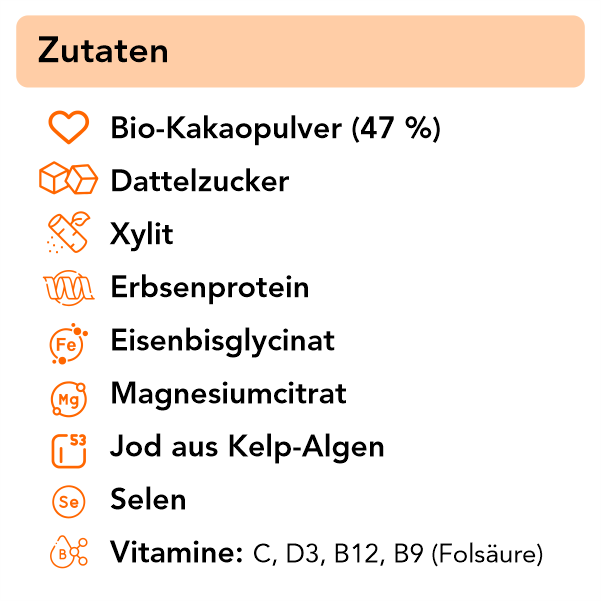 Die Basis bildet ein aromatischer 47 % Bio-Kakao aus fairem, kontrolliert biologischem Anbau. Die natürliche Süße kommt von Datteln und Xylit – ohne Industriezucker, ohne künstliche Zusätze.