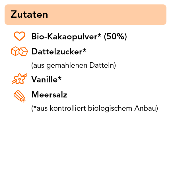 Ja – aber auf die gute Art. Gesüßt wird ausschließlich mit gemahlenen Datteln. Keine zugesetzten Zucker, keine Süßstoffe. Nur natürlicher Kakaogenuss mit einer dezenten karamelligen Note durch die gemahlenen Bio-Datteln.