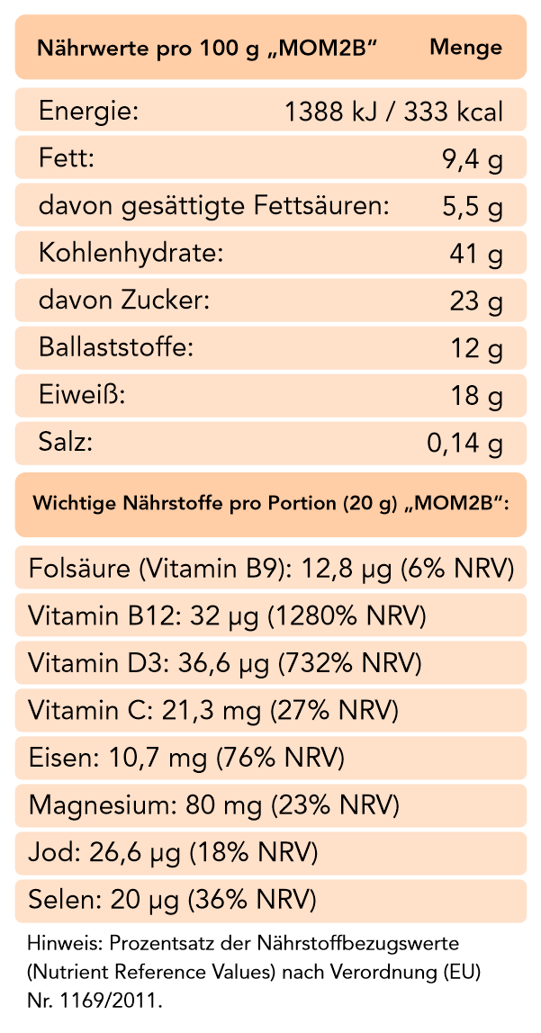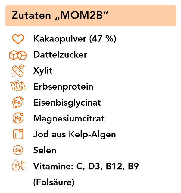 Ich bin MOM2B – ein durchdachter Kakao für Schwangere, für Wunschbabyphasen und alle, die sich bewusst und nährstoffreich begleiten lassen möchten. Mit 47 % Kakao, einem ausgewogenen Nährstoffprofil und ehrlichen Zutaten begleite ich Dich durch besondere Zeiten – ganz ohne Schnickschnack. Mit Folsäure, Eisen, Jod, Magnesium, Vitamin B12, D3 & C.